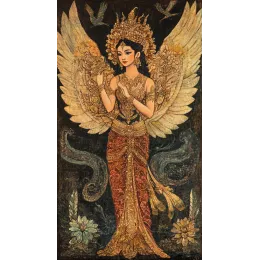 A divine female angel depicted in the intricate and highly detailed Balinese traditional painting style from the early 20th century. She is adorned with golden, floral-patterned garments, elaborate headdresses, and delicate jewelry, embodying the spiritual elegance of Balinese Hindu mythology. Her large, ethereal wings are finely decorated with swirling batik patterns and tropical motifs, glowing softly in the moonlight. She stands gracefully amidst a celestial jungle, surrounded by mythical creatures and floating lotus flowers. The painting is rich in vibrant colors, predominantly gold, deep red, and emerald green, with fine, hand-drawn textures characteristic of Balinese temple murals. The composition is dynamic, with intricate details in every corner, reflecting the ornate storytelling traditions of Balinese art.